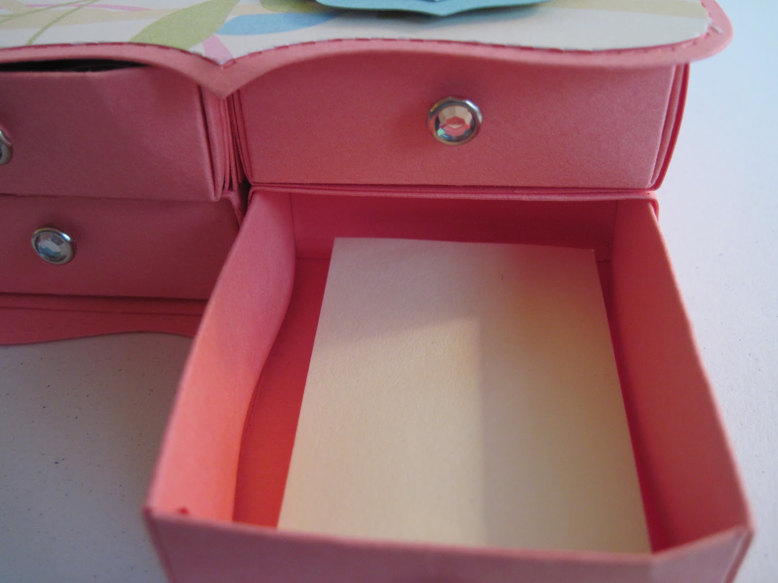 This is how the little drawers pull out. They're made with the Matchbox die and I put Rhinestone brads through each one for drawer pulls.
